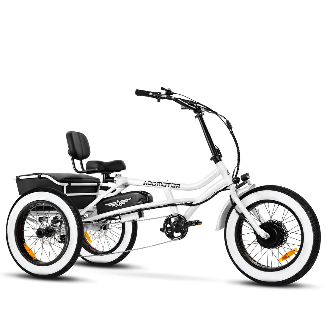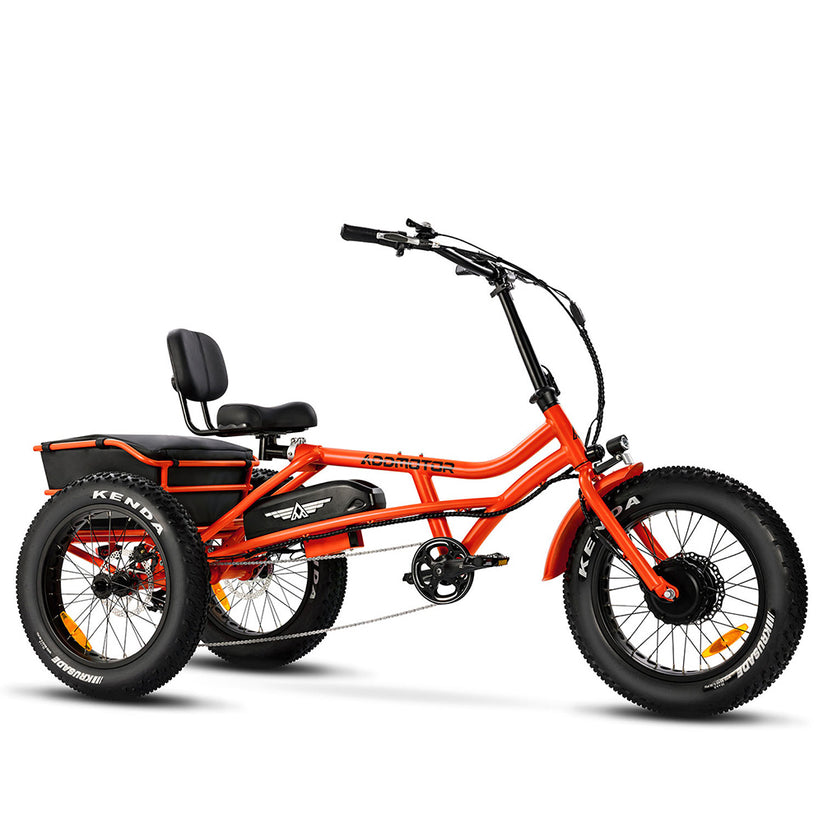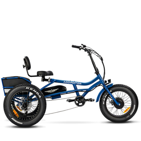 The trike runs on a 48-volt system and has a 20 AH battery for an estimated max mile up to 85 with pedal assist.