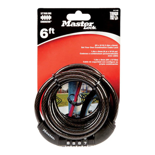 The Master lock No. 8114D set your own combination cable lock is 6 feet (1.8m) long and features 5/16 inch (8mm) diameter braided steel for maximum strength and flexibility. The protective vinyl coating protects against scratches. The 4 dial combination security offers keyless convenience. The Limited Lifetime Warranty provides peace of mind from a brand you can trust.